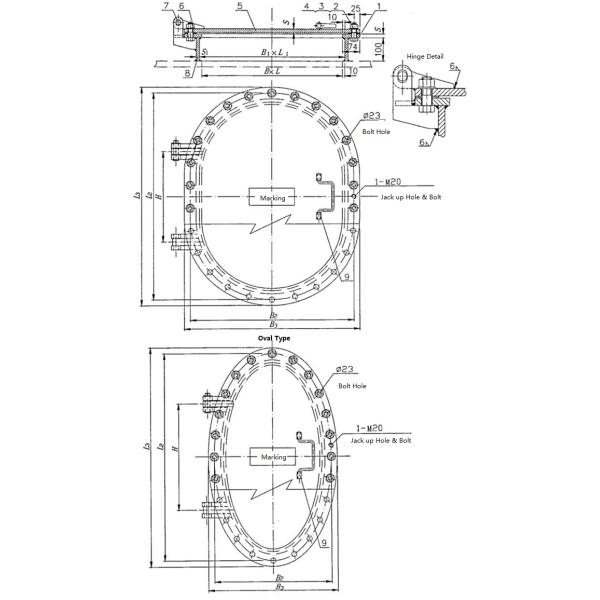 Drawing of CB/T 4392 Type EA Raised Oval Multi Bolts Manhole Cover With Hinges Marine Outfitting